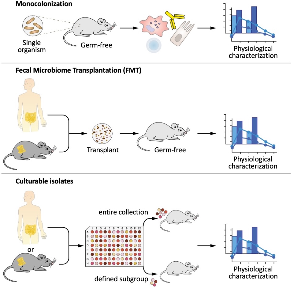 All animals and humans maintain a close symbiosis with their microbiome – the entirety of their associated microorganisms. Microorganisms colonize every surface of the host that comes into contact with the outside world. By far the most microorganisms are found in the intestine and the largest proportion of them are bacteria. The intestinal microbiome is dominated by anaerobic bacteria and is composed of approximately 500-1,000 species belonging to only a few phyla. It has become clear that the microbiome exerts an immense effect on numerous aspects of host physiology, for example by promoting the development of the immune system, providing calories and vitamins from otherwise indigestible dietary components or protecting against pathogenic colonization. The composition of the microbiome varies greatly between different people, yet within an individual, the composition of the microbiome is relatively stable over time. Deviations from this stable homeostasis, i.e. changes in microbiome composition, are referred to as dysbiosis and are associated with numerous diseases, such as diabetes, chronic inflammatory diseases or colon cancer. In most cases, however, it is not clear whether the dysbiosis is causally involved in the pathogenesis of the disease or whether it arises secondarily as a result of the disease or its treatment, e.g. through inflammatory reactions, medication or changes in eating habits. Functional studies, for example using gnotobiology, are therefore crucial to establish a causal relationship between changes in the microbiome and disease processes.