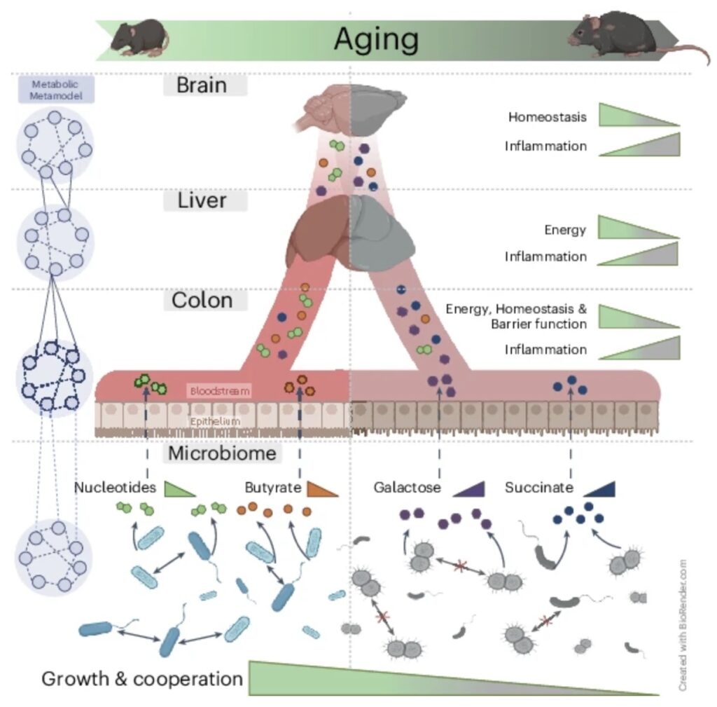 In this collaborative effort, we find that metabolic activity of the microbiome declines with aging along with beneficial interactions not only between bacteria but also with the host. Together, our results elucidate microbiome-host interactions potentially influencing host aging processes, which could serve as future targets for the development of microbiome-based anti-aging therapies.