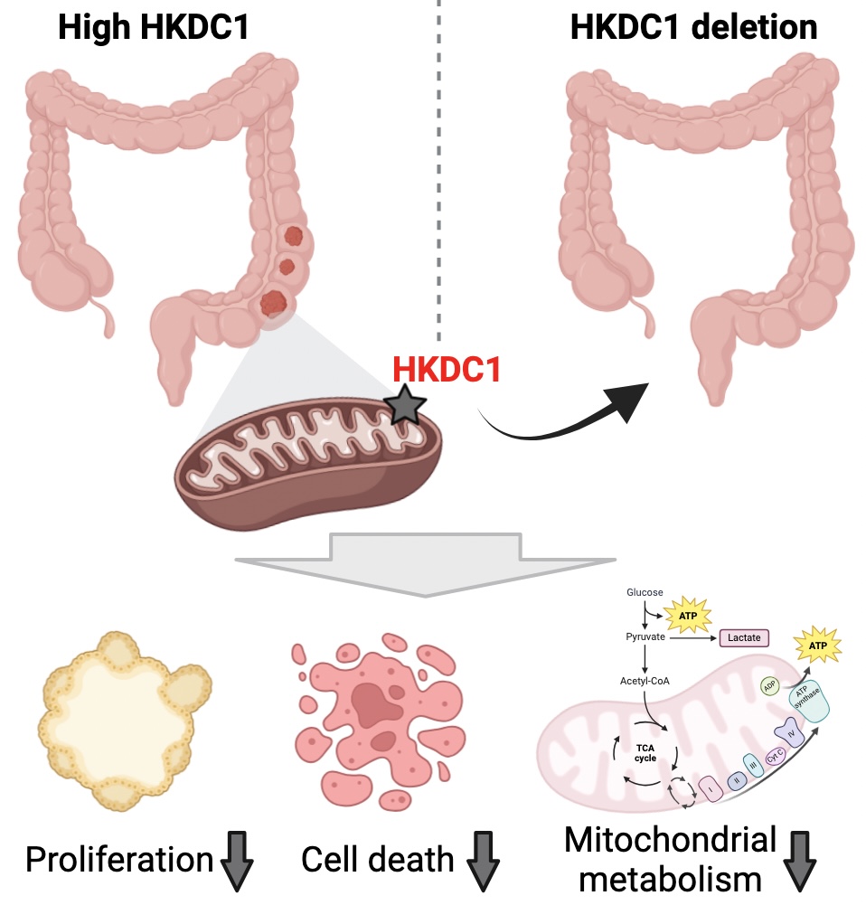 We find that deletion of the unconventional hexokinase HKDC1 alters various hallmarks of cancer cells including proliferation, cell death and mitochondrial metabolism, and thereby protects from intestinal carcinogenesis. These findings are exciting because they highlight a new way to treat colon cancer. Stay tuned – hopefully more to come soon!