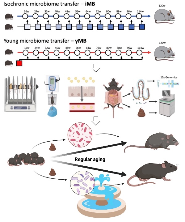 By performing a microbiome-therapy in a gnotobiotic mouse model and using a variety of functional assays we discovered that microbiome rejuvenation slightly expanded life expectancy and improved motor coordination and intestinal permeability. Molecular analyses including 16S rRNA gene profiling, metagenomics, single‐cell RNA sequencing and metabolic modelling revealed beneficial metabolic and immunological profiles in both the microbiome and host with, for example, fewer encoded pro‐inflammatory factors and more stable ecological interactions. Together, our data show that, indeed, life‐long and repeated transfer of microbiota material from young individuals improved age‐related processes, thus highlighting the potential of microbiome-based anti-aging therapies.
